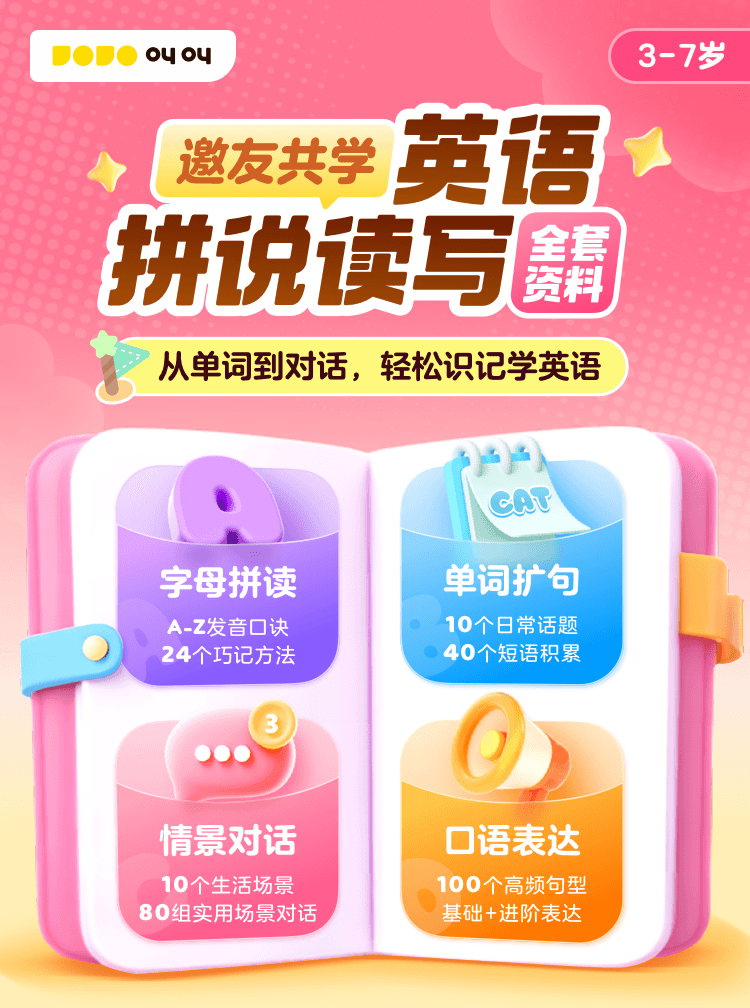 别担心!《英语拼说读写全套资料》重磅来袭!专为3-7岁孩子设计,通过科学分级和场景化学习,让孩子轻松掌握英语拼说读写的核心技能,打好英语基础!