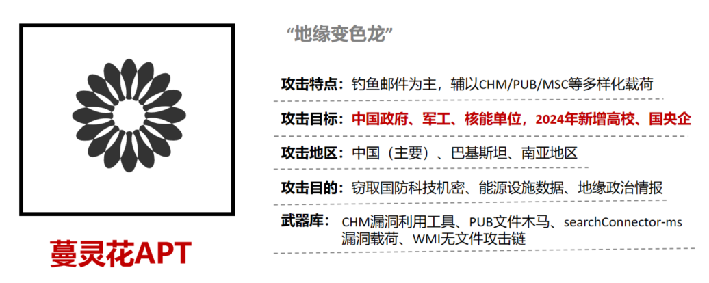 白象APT凭借三大“杀手锏”上榜本次“黑榜”。一个是精准 “学术范”社工,其常常盗用其他知名高校或科研单位邮箱账号,发送“国家重点研发计划”、“国际学术会议邀请函”等高可信钓鱼邮件,连教授都难辨真假;其次是攻击手法轻量化,不依赖复杂漏洞,而是用LNK文件伪装PDF图标、内存加载无文件木马,全程不留痕迹;最后是话术精准,生成高度契合的钓鱼内容,例如针对气象学专家发送“国家气象局雷达气象重点实验室评估材料”等。蔓灵花是一支具有强烈政治背景的境外APT组织,长期瞄准中国、巴基斯坦等国的“大国命脉”——从政府机密、军工技术到核能设施,2024年更是将高校和央国企纳入攻击清单。蔓灵花的攻击诱饵紧跟政策热点和学术动态,例如伪造“高校科研提案”、“使馆合作函件”,专挑国家关键领域下手,以投递木马,信息窃取为主,堪比“地缘间谍变色龙”。