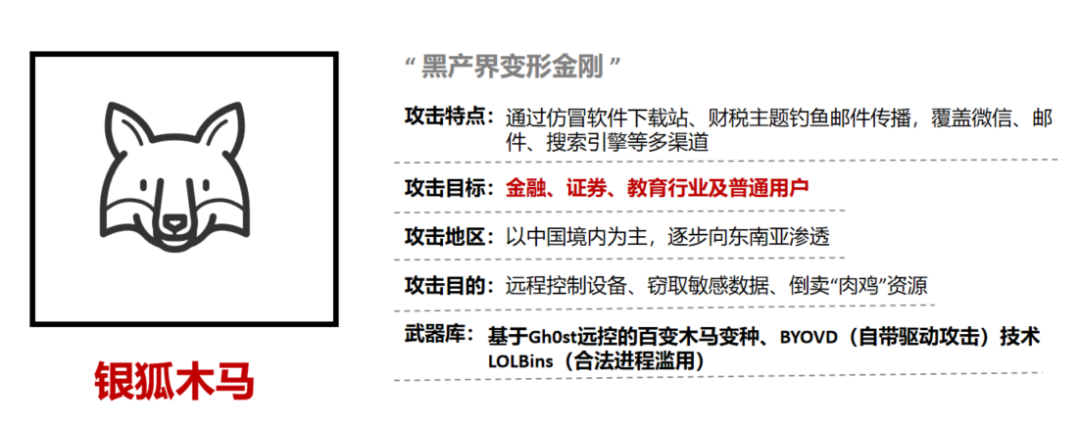 提起银狐,估计你已非常熟悉。2024年,银狐木马相关IOC持续不断,整体变种多达上百种,每周都有新的银狐木马变种在互联网传播。它是4月顶着财税主题邮件的“政府通知”,是8月伪装成办公软件安装包的“办公助手”,也是一键切换为安全软件的安装程序,堪称黑产界的 “变形金刚”。根据微步情报局统计,截至目前使用银狐木马的黑产团伙已增至30个。
