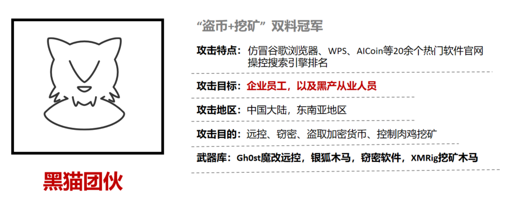 GanbRun是2024年攻击最频繁,涉及范围最广的黑产团伙。其攻击手法看似简单,但又极具杀伤力。2024年,GanbRun新增邮箱升级与邮箱安全认证窃取账密信息,同时该团伙又升级了薪酬补贴的钓鱼模板,对于附件的word文档新增了通过密码进行打开,以此规避安全设备的钓鱼邮件检测。2024年10月,微步情报局发现主流搜索引擎在搜索“谷歌浏览器”时,某搜索引擎结果排名第一的竟是仿冒下载站,对应的安装包则是后门木马。经过微步情报局跟踪分析,攻击者不仅仿冒谷歌浏览器,而且仿冒VPN、上网加速器等常用软件或是仿冒虚拟货币行情交易平台等,累计达20多个。由于团伙所用域名含有大量“heimao-*(三位数字).com”特征域名,微步情报局首次将该团伙命名为“黑猫”。