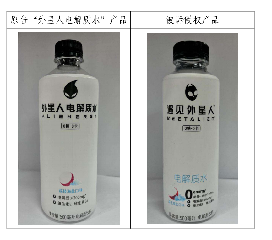 案件二:元气森林起诉江苏某食品公司侵害元气森林“火星人”注册商标专用权及侵害外星人电解质水包装装潢不正当竞争纠纷一案,无锡市中级人民法院一审审理认定被告在其生产和销售的“火星人电解质饮料”产品上使用的“火星人”标识构成对元气森林享有独占授权的第32类“火星人”商标的侵权(该商标系元气森林的防御商标)。且鉴于其与外星人商标客观上具有一定近似,容易造成消费者的混淆。元气森林提供的证据足以证明外星人电解质水的包装装潢已具备一定的知名度和影响力,而被告生产的侵权产品包装装潢整体视觉效果与外星人电解质水近似,故构成不正当竞争。同时该被告在销售中使用“火星人电解质水全国销量领先”的广告语无事实和依据,构成虚假宣传。最终一审法院判决该被告立即停止侵权行为并赔偿元气森林经济损失200万元。目前本案尚处于二审阶段。