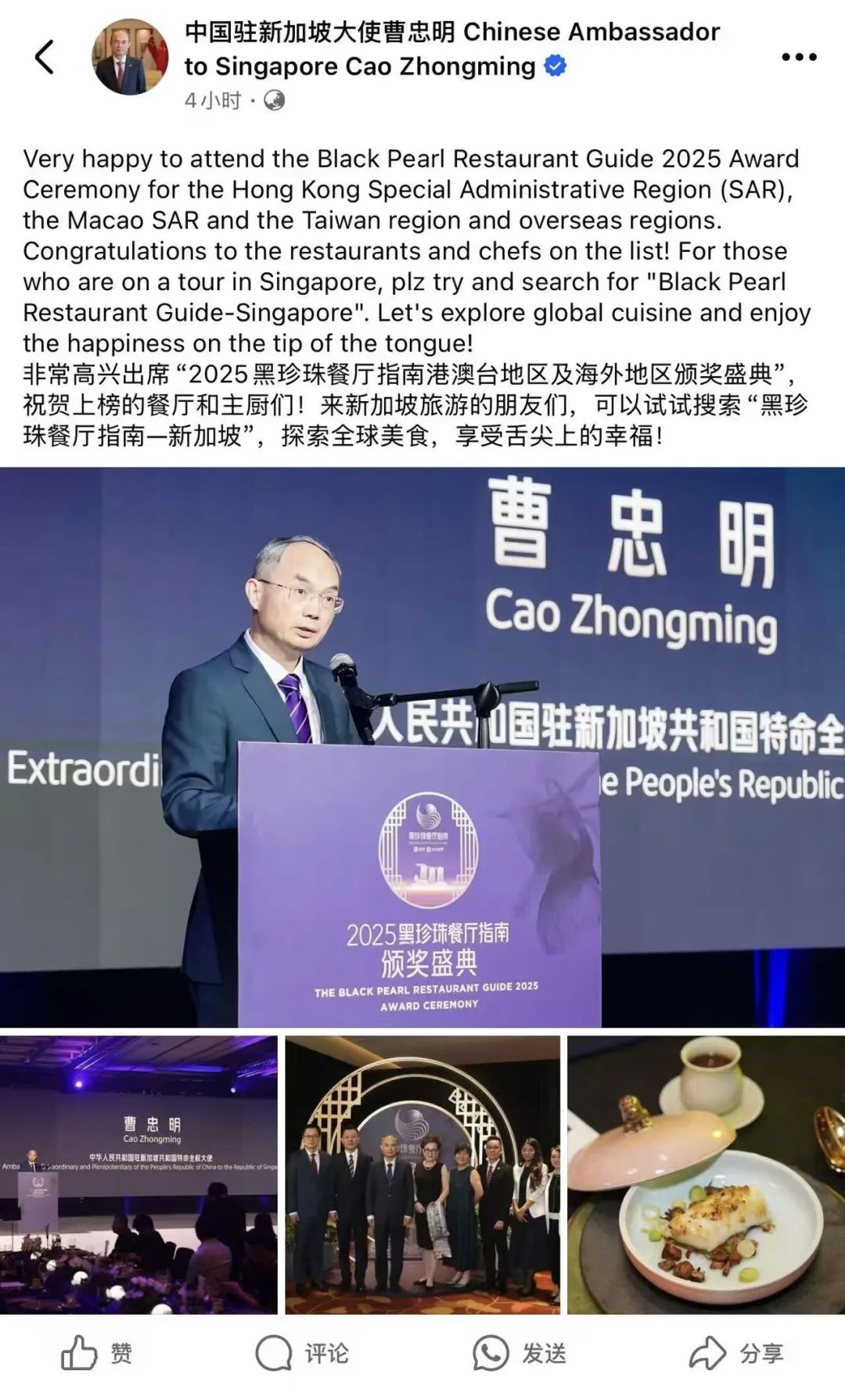 中国驻新加坡大使曹忠明、新加坡旅游局大中华区首席代表兼执行署长潘政志共同揭晓榜单。这份中国人自己评选出的精致餐饮榜单,让全球精致餐饮和“中国味蕾”双向奔赴,据悉共有55家海外餐厅上榜。