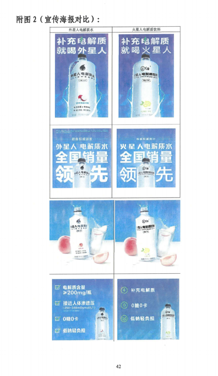 案件二:元气森林起诉江苏某食品公司侵害元气森林“火星人”注册商标专用权及侵害外星人电解质水包装装潢不正当竞争纠纷一案,无锡市中级人民法院一审审理认定被告在其生产和销售的“火星人电解质饮料”产品上使用的“火星人”标识构成对元气森林享有独占授权的第32类“火星人”商标的侵权(该商标系元气森林的防御商标)。且鉴于其与外星人商标客观上具有一定近似,容易造成消费者的混淆。元气森林提供的证据足以证明外星人电解质水的包装装潢已具备一定的知名度和影响力,而被告生产的侵权产品包装装潢整体视觉效果与外星人电解质水近似,故构成不正当竞争。同时该被告在销售中使用“火星人电解质水全国销量领先”的广告语无事实和依据,构成虚假宣传。最终一审法院判决该被告立即停止侵权行为并赔偿元气森林经济损失200万元。目前本案尚处于二审阶段。