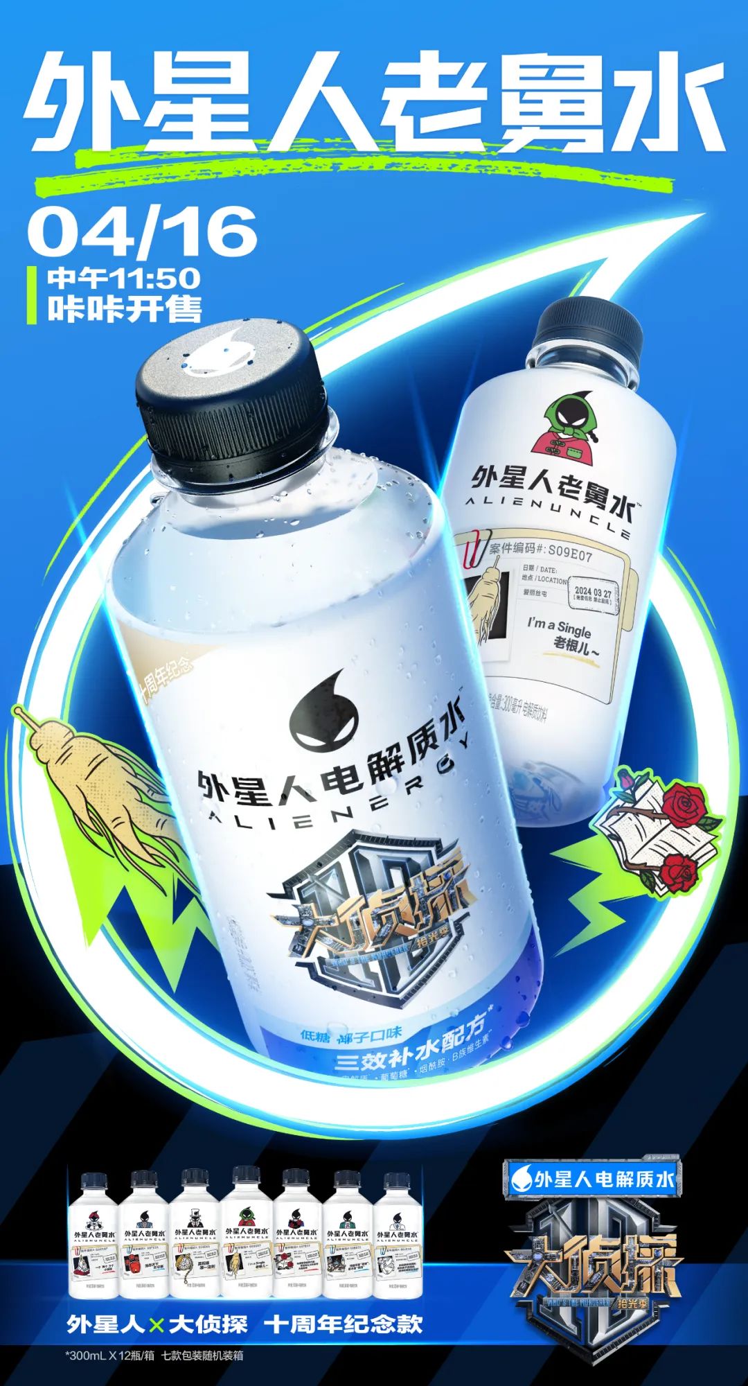 4月16日,外星人电解质水与独家冠名综艺节目《大侦探》共同推出外星人×大侦探十周年纪念款产品“外星人老舅水”。“外星人老舅水”为椰子口味低糖电解质水,共有7款不同包装,瓶身包装设计灵感取材于《大侦探》节目“十年名场面”,随机装箱,每箱300mLX12瓶,每箱内还随机发送冰箱贴一个。
