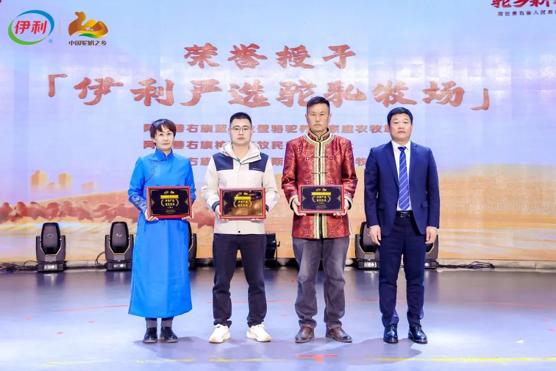 签约仪式特别设立的授勋环节中,伊利为阿拉善右旗3位双峰驼牧场主颁发「伊利严选驼乳牧场」荣誉奖牌。这些牧场主恪守原生态养殖模式,最终粹炼出万分之一的珍稀驼乳。