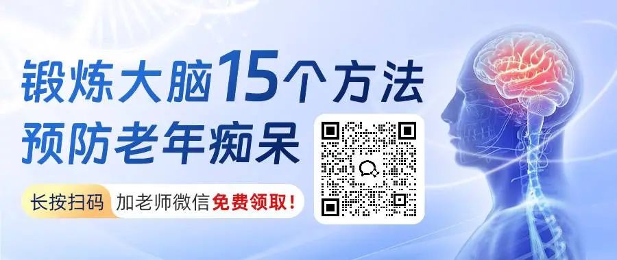 1、Ruohan Zhang et al, Associations of dietary patterns with brain health from behavioral, neuroimaging, biochemical and genetic analyses,Nature Mental Health(2024).2、钟财芬.适合国人的护脑饮食[N].生命时报,2025-4-15(1).✨年纪大了总忘事?注意力不集中?别担心,护脑其实很简单!长轻特别为大家整理了《锻炼大脑的15个方法》,简单又实用,帮助您提升记忆力、专注力和抗衰老能力,预防老年痴呆!↓扫描下方二维码领取↓
