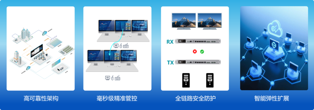 采用分布式光纤KVM架构,双电源冗余及毫秒级主备链路切换,确保系统可用性,全面支持塔台多设备接入。