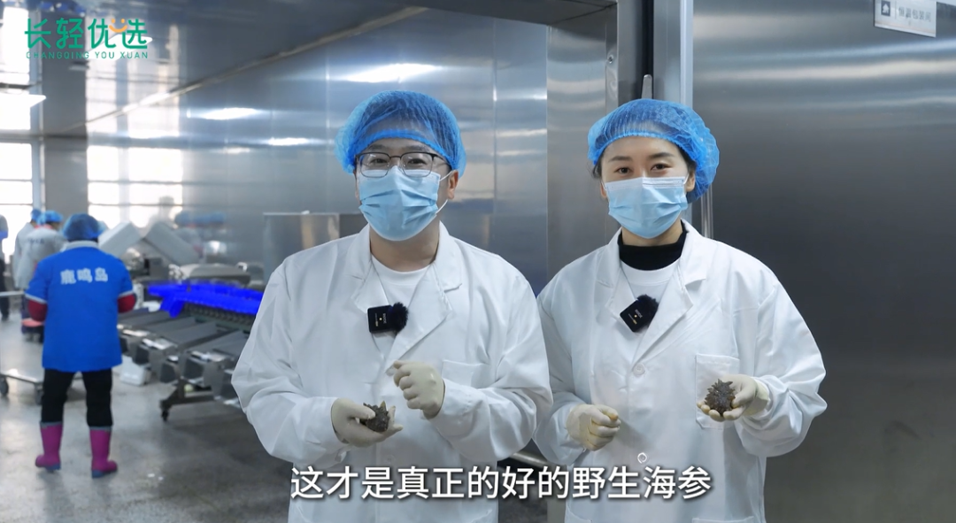 观众通过镜头看到:海碰子采捕的海参,经验丰富的老师傅手工去除内脏,每一个环节都严苛遵循ISO22000食品安全管理体系,长轻溯源团队更是实现首次登岛直播。
