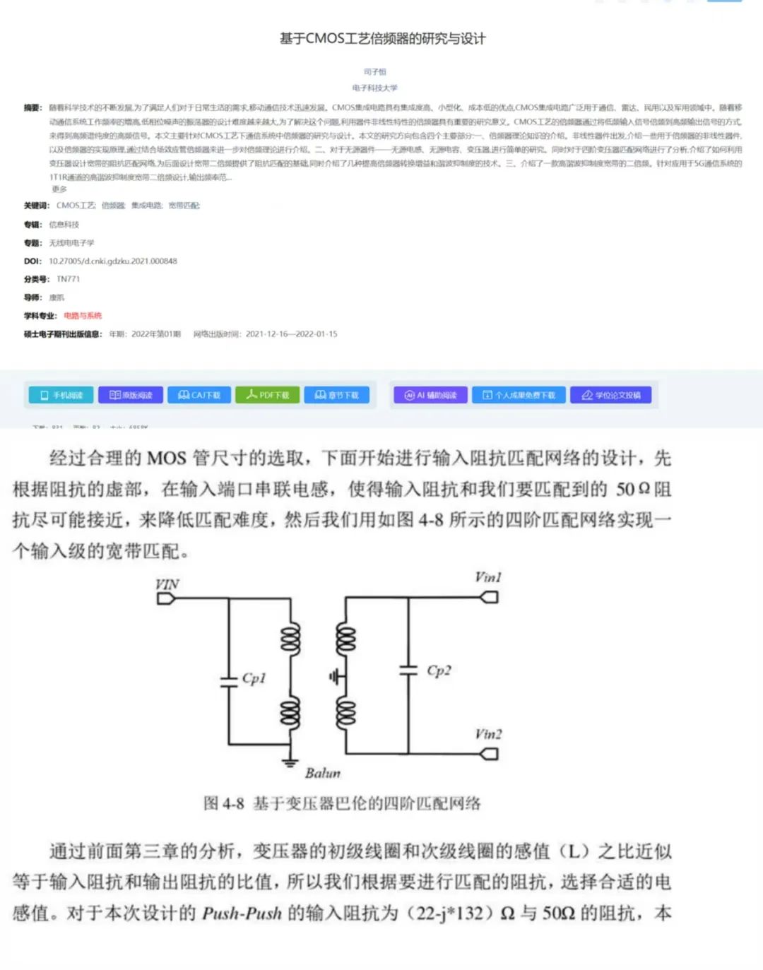 A:实际巴伦有电感和寄生电阻,需要LC匹配网络来匹配到50Ω,可以看一下这篇论文: