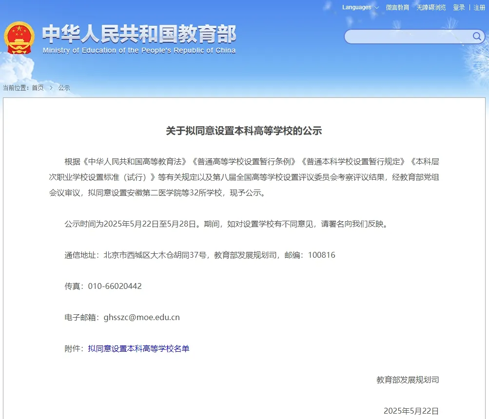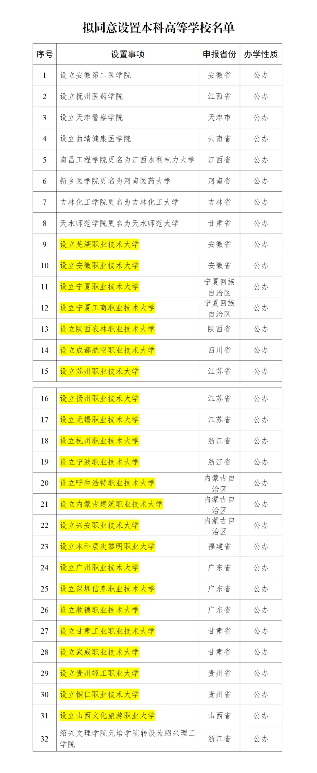 5月22日,教育部发布“关于拟同意设置本科高等学校的公示”。经教育部党组会议审议,拟同意设置安徽第二医学院等32所学校。其中共有23所高职院校拟升格本科职业大学。