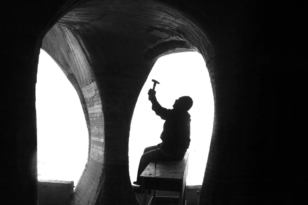 复杂的三维曲面壳体,由秦皇岛当地擅长造船的木工用木模板等小尺度线性材料手工编织出的模板定型,再用混凝土浇筑而成。壳体上留下的不规则、不完美的肌理被保留,被槐树林的根系固化,再被沙和风不断打磨,让人类和大自然建造的痕迹可以以手触摸、感知。