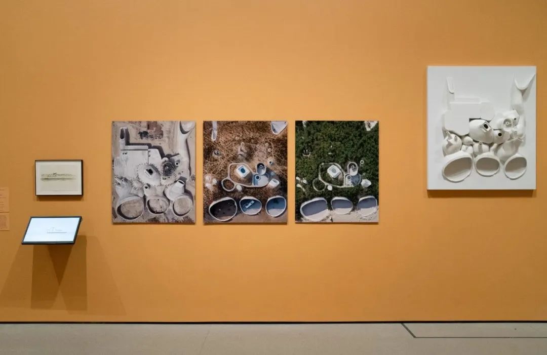 从封顶时的曲面结构,到完工时被金色沙丘掩盖、再到完工后第二年夏季被植被覆满,三张俯视角度的大幅航拍照片被并排放置在墙面正中心的位置,记录建筑植入自然,又与自然融为一体的进程。