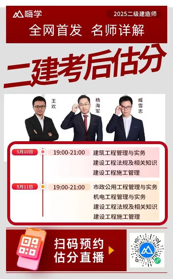 走出考场之后,一定要记得锁定嗨学,锁定嗨学课堂!嗨学名师详解2025回忆版真题答案,带给你超迅速的估分体验。5月10日-5月11日晚19点!2025年二建考后真题解析直播!识别下方小程序码,立即预约真题解析直播,赶紧来对答案,估分预约上岸!