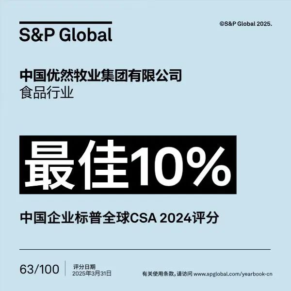 2025年4月,全球权威评级机构标普全球(S&P Global)正式发布《可持续发展年鉴(中国版)2025》,旨在识别并表彰在各自行业中展现出可持续发展优势的中国企业。优然牧业凭借在环境、社会、治理及经济方面的持续卓越表现,入选《可持续发展年鉴(中国版)2025》,位列中国企业标普全球CSA2024评分最佳10%。