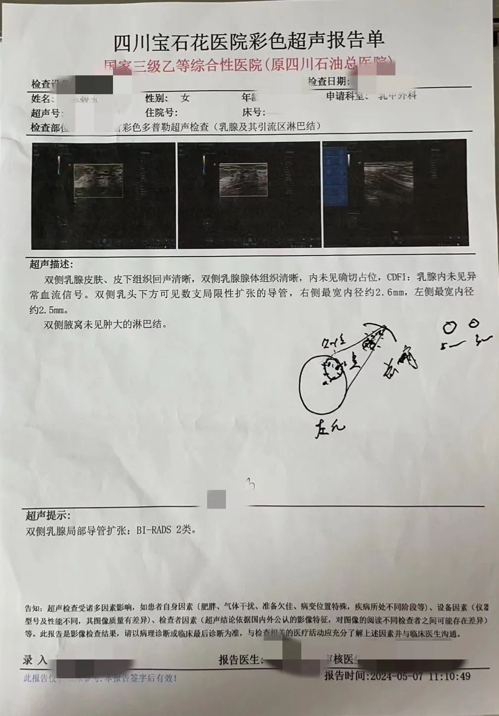 “波主任,多亏您的火眼精金,帮我排除了身体里的定时炸弹……”回想起一周以来“体检”、手术等一系列操作,吴女士(化名)感觉得像做了一场梦。50岁出头的吴女士,是个注重健康的人,每年都会自费进行女性两癌筛查。今年,听亲朋好友介绍说四川宝石花医院乳甲外科陈波主任医术精湛,便和朋友慕名组团来院“体检”。就诊中,吴女士超声结果提示双侧乳腺局部导管扩张:BI-RADS2类,双侧乳房没有明显异常。