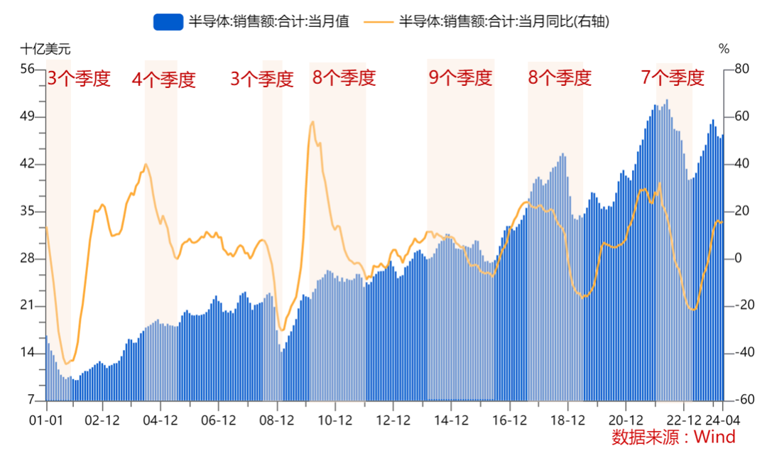 历史上半导体行业有7次明显的下行周期,最短的是3个季度,最长的是9个季度,平均时间维度在6个季度左右。本次周期从2021年4季度见顶,持续7个季度后,销售额在2023年2季度开始出现拐点。当前,全球半导体库存周期在AI及新型消费电子带动下正加速回升。