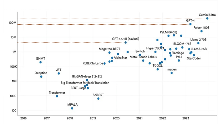 在AI的比拼中,算力是执行算法所需的硬件资源,包括CPU、GPU、TPU等芯片。算力水平直接关系到AI大模型训练的速度和效率,是实现模型快速迭代和优化的关键,各厂商、研究机构所开发的模型为获得更好的性能,用到的数据量和参数规模均呈“指数级”增长,算力需求持续提升。