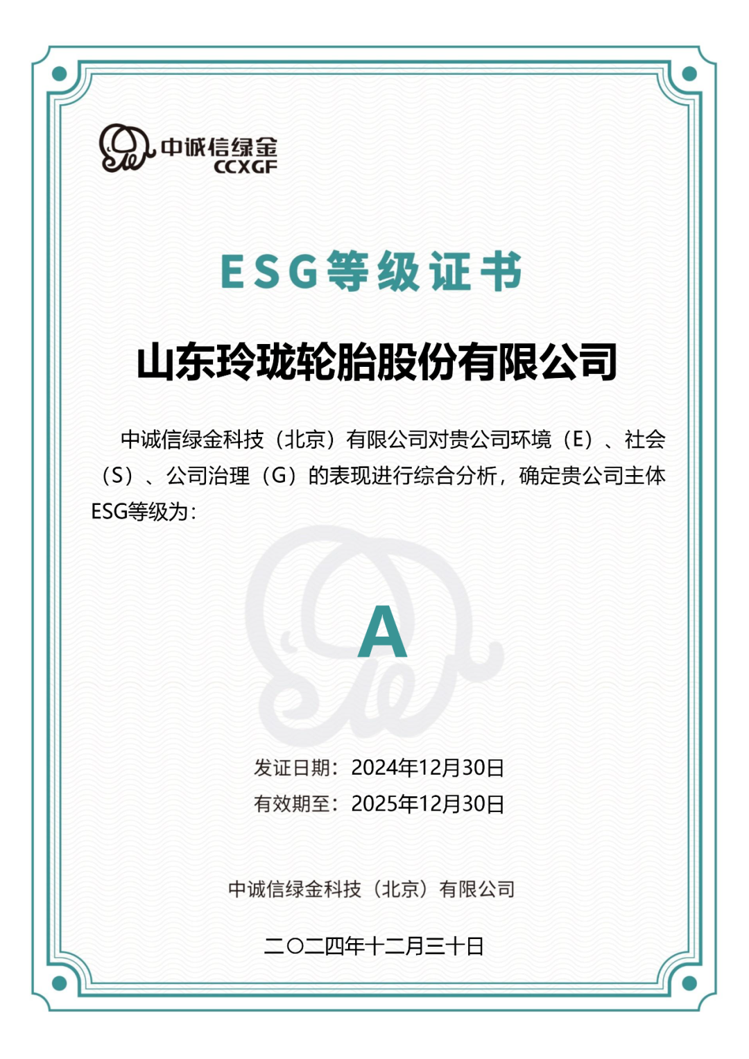 日前,玲珑轮胎再传喜讯,公司成功获得中诚信绿金国际有限公司(以下简称“中诚信绿金国际”)出具的ESG等级证书,评级等级为“A”,综合得分7.87分,在汽车零配件行业251家上市公司中排名第6,标志着玲珑可持续发展成果已稳居行业前列,成为绿色转型标杆企业。