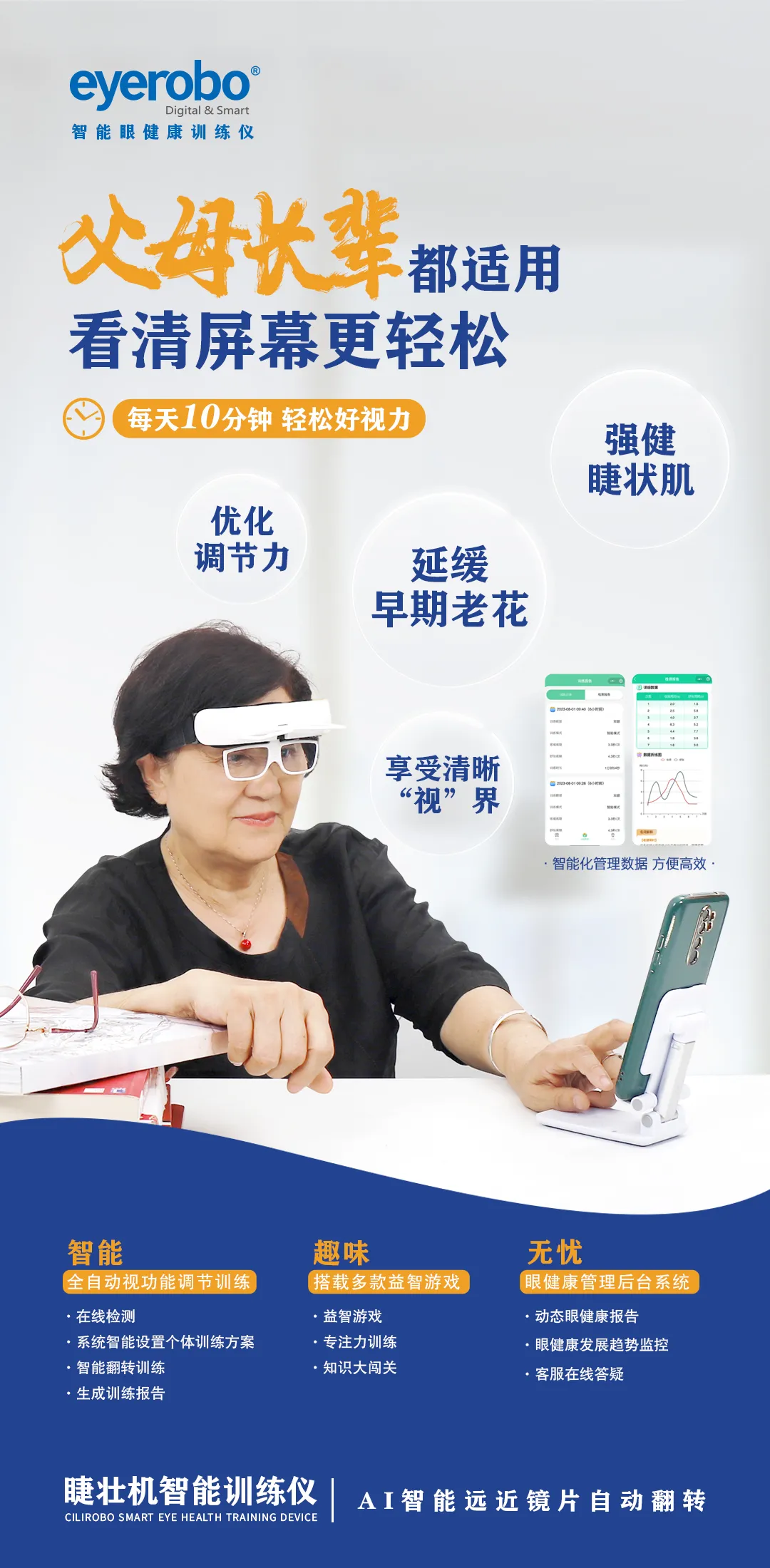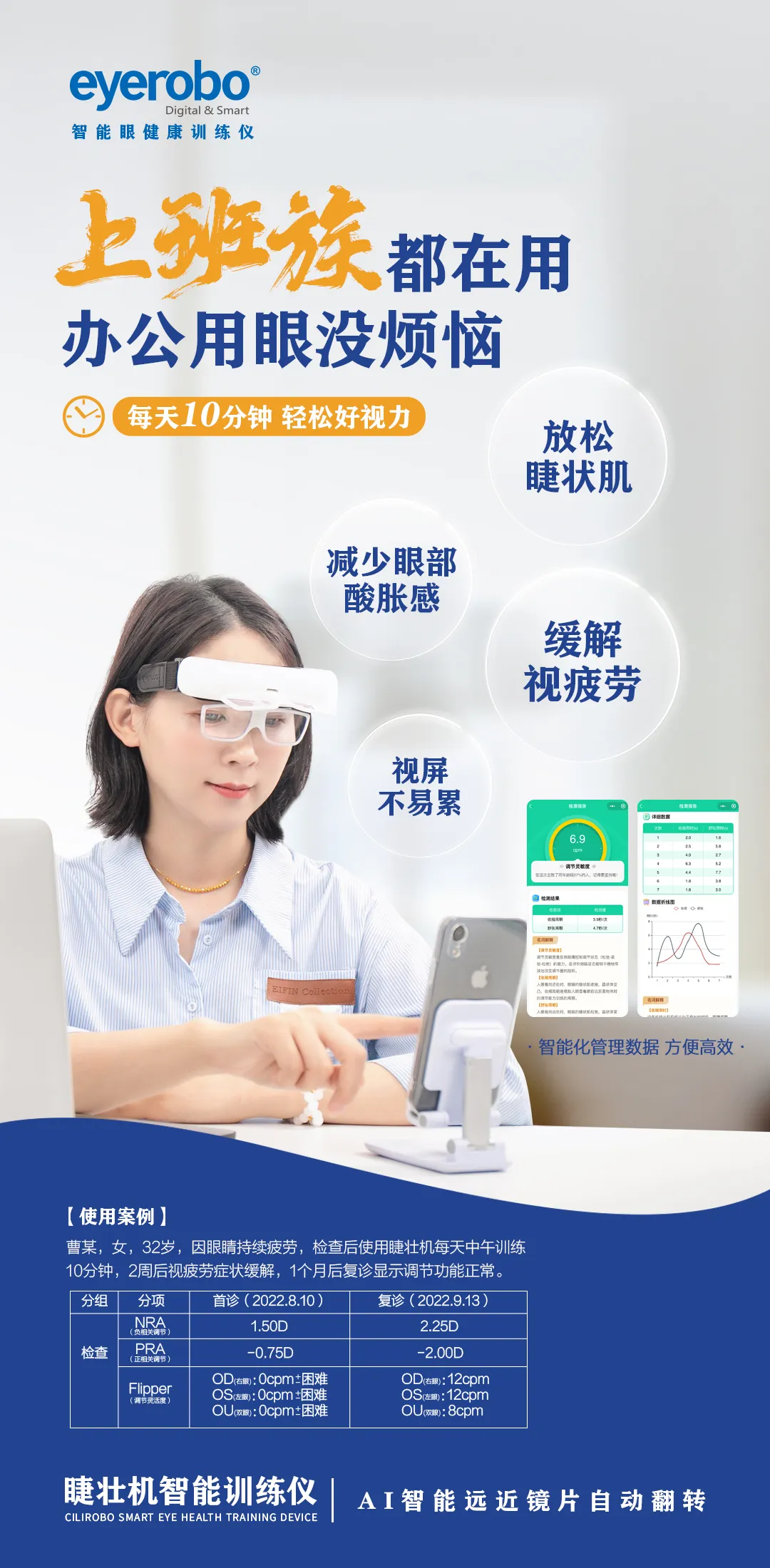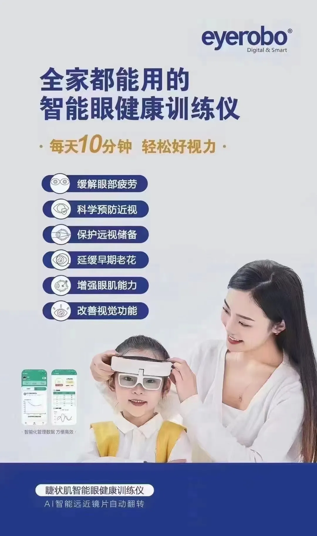 睫壮机智能眼健康训练仪将智能视功能调节训练与智慧眼健康管理系统相结合,根据不同人群每天动态变化的调节聚散功能参数,制定个性化训练方案,改善眼睛调节聚散功能,放松双眼,防控近视、老花的发生和发展!每天佩戴10分钟 =1500次远眺+30次眼保健操!