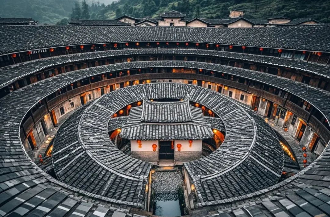 冷知识:福建土楼的环形结构不仅能御敌,还暗藏“聚水”玄机。雨季时,屋檐雨水汇入中心井台,形成“小满江河渐满”的微缩景观。