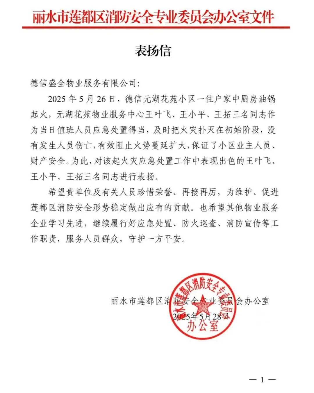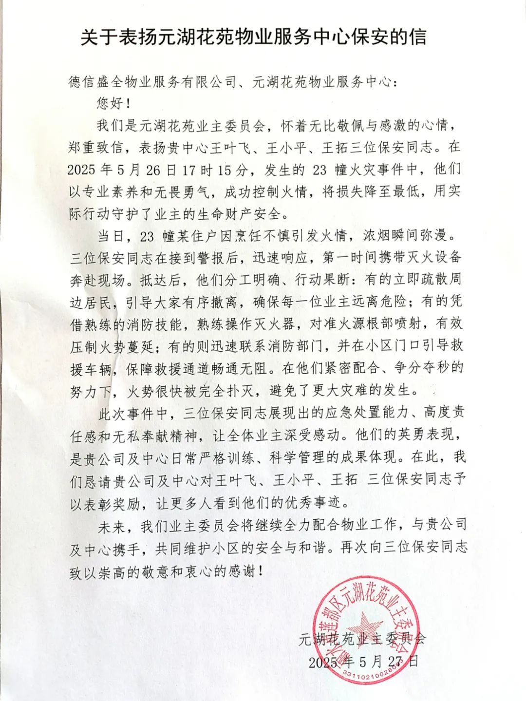 这两天,小区业委会和丽水消防部门也接连发来表扬信,盛赞王叶飞、王小平、王拓三名“烈火逆行者”的英勇与专业!