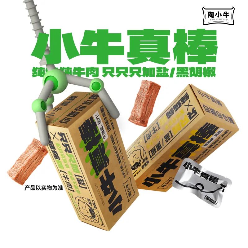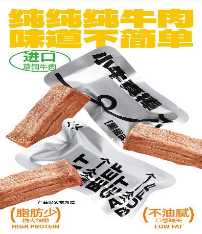 比如,饿了馋嘴了可以来一根陶小牛牛肉棒,源自山西省平遥县特产,进口草饲牛牛肉,独立包装,真空锁鲜。48h排酸,24h恒温蒸煮,脂肪少,精肉细腻,口感鲜美不油腻。以黑椒味为例,100g含碳水化合物低于1%,蛋白质超过52%,配料表干净,不添加亚硝酸盐。