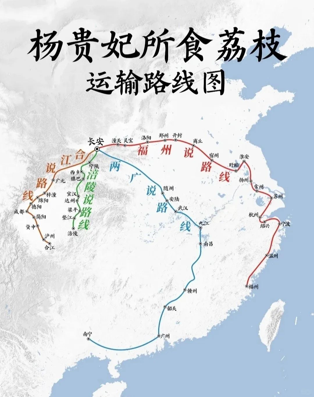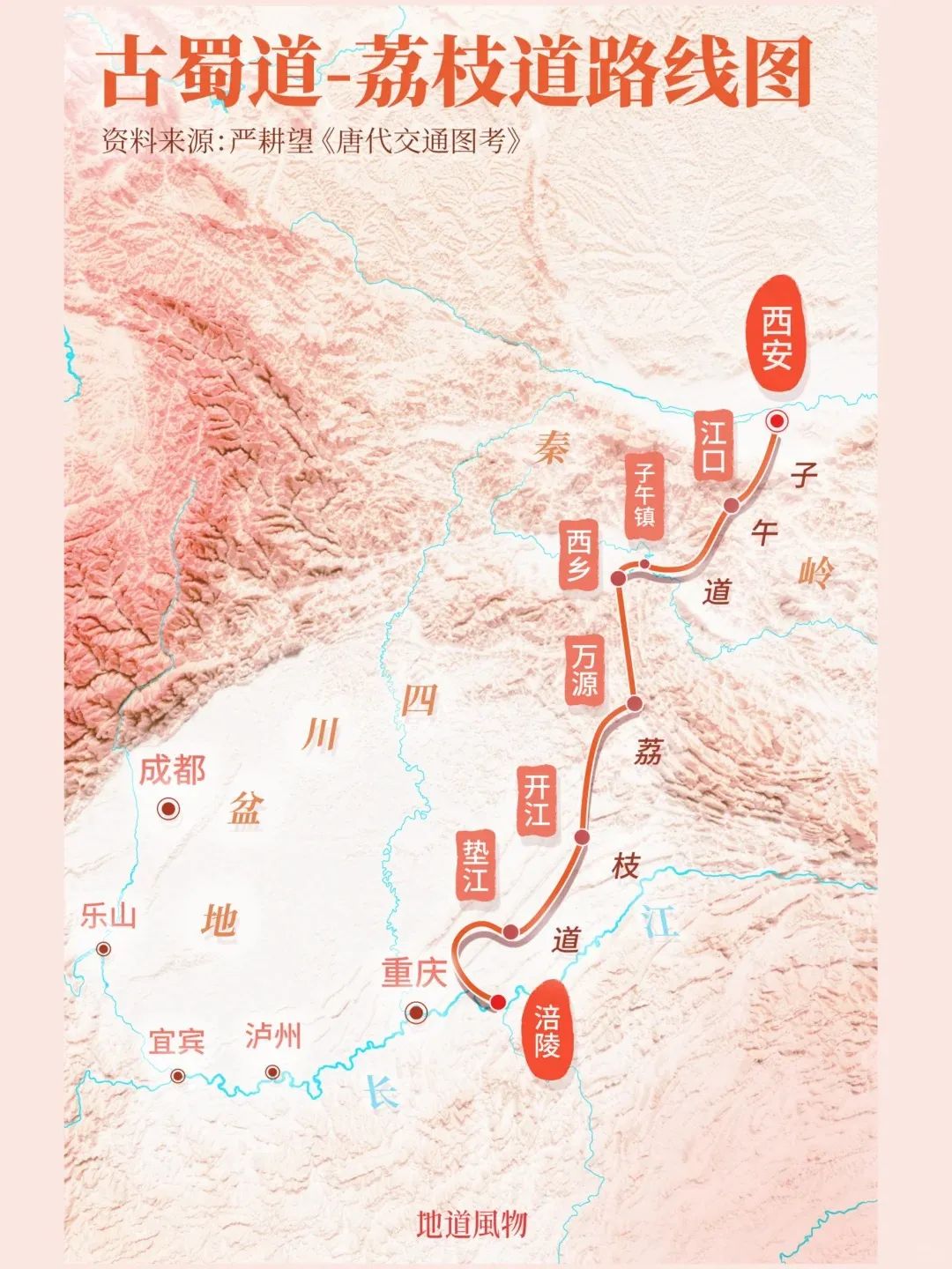 事实上,目前被大家接受的主流路线是“涪陵线”(起点为今重庆市涪陵地区)。这条“荔枝道”全程约1800里,分为三段: