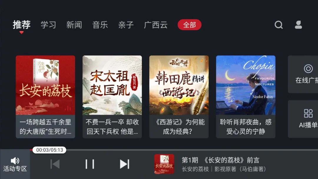 更多“荔枝路上的故事”,您可速速登录云听车载应用,点击收听《长安的荔枝》有声剧,跟随说书人时而甜腻如蜜枣,时而淬火般烫耳的声线,纵马滚滚红尘。