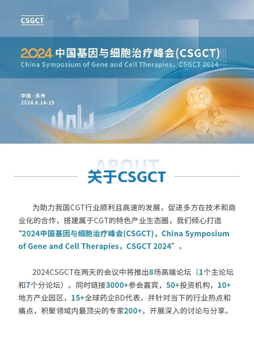 2024中国基因与细胞治疗峰会(CSGCT)将于2024年6月14-15日在苏州举办。此次峰会旨在搭建行业内优质的交流平台,聚焦CGT行业的热点和痛点,汇聚行业内的顶尖专家,开展深入的讨论与分享,共同推动国际化的产业融合,助力中国CGT产业的发展。