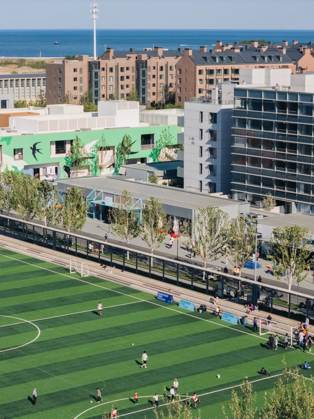 由英国足球创意机构DENT studio操刀设计,ANAR 足球场是一片标准十一人制人草足球场,并可根据需求转变成九人制、五人制场地。作为雀跃镇地标性体育场馆,ANAR足球场不设入场门槛,全年龄段足球爱好者都可以无障碍免费使用场地,同时也接受包场、承办各类比赛。