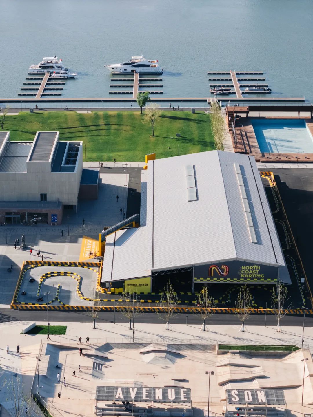 一片占地超1.2万平方米的滨河滑板公园,不仅拥有满足世界级赛事标准的街式和碗池场地,也有适合全年龄层的休闲场地和绿地公园,还融合了一间AVENUE & SON旗舰店、一间THE CIRCLE DANCE LAB舞蹈工作室、一个包含了日本PRETTY SOLID 滑板专业学校的室内街式滑板公园,让街头文化融于海边日常。