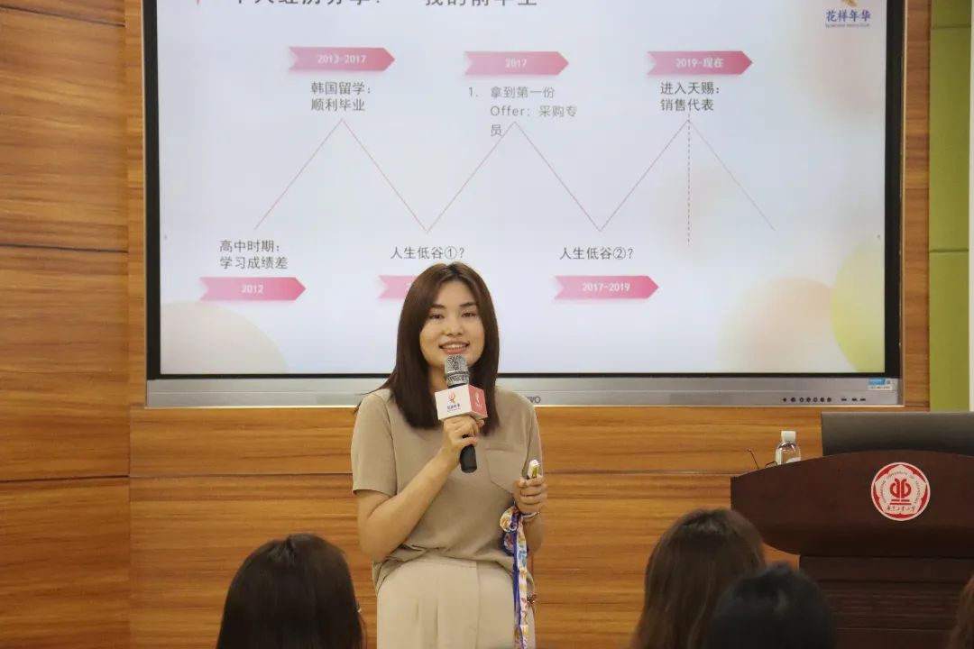 介绍环节结束后,来自花样年华俱乐部的三位优秀嘉宾带来了不一样的精彩的职场主题分享,不同于校园内的传统授课,从不同岗位角色分享真实职场人的经历让现场的同学们听得津津有味,并积极提问互动。