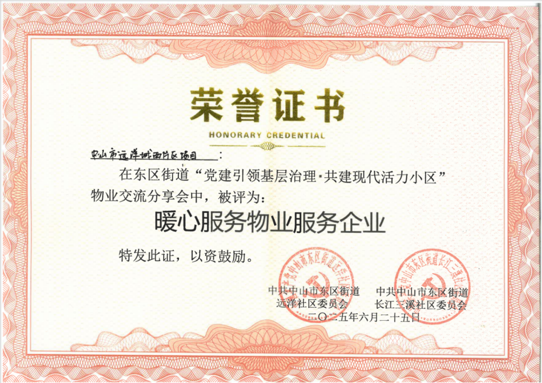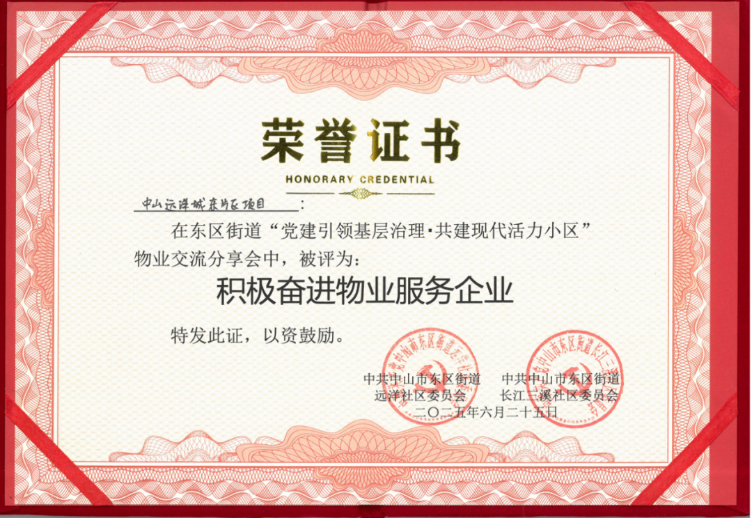 “党建引领、四方共治、解决实事”的扎实模式与“红心善治”阵地的显著实效,不仅吸引了众多同行专程前来交流学习,成为行业标杆,更获得了政府的高度认可!正是这种聚焦业主需求、解决实际问题、提升家园品质的共建共治共享成效,中山远洋城荣膺中山市东区街道办等单位颁发的“暖心服务物业服务企业”及“积极奋进物业服务企业”两项殊荣! 这既是对治理模式的标杆效应的印证,更是对以党建引领、凝聚四方力量、深化服务、激发社区活力的最有力肯定!