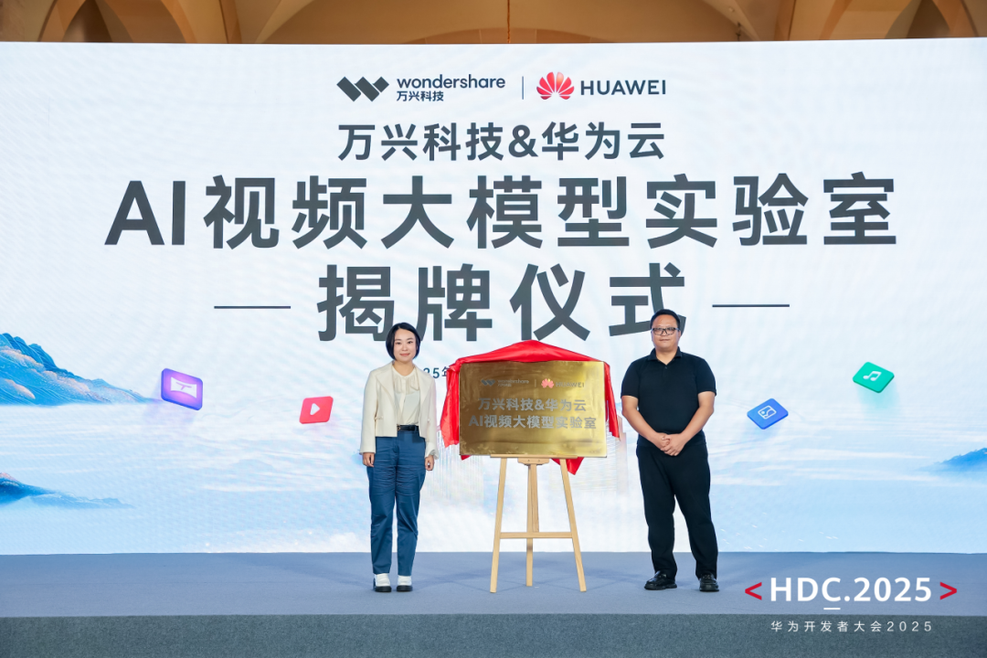 论坛现场,万兴科技与华为云共同为“AI视频大模型实验室”揭牌。双方将整合优势技术与资源,深度探索AI在数字创意领域的应用边界,共同推动行业创新与发展。