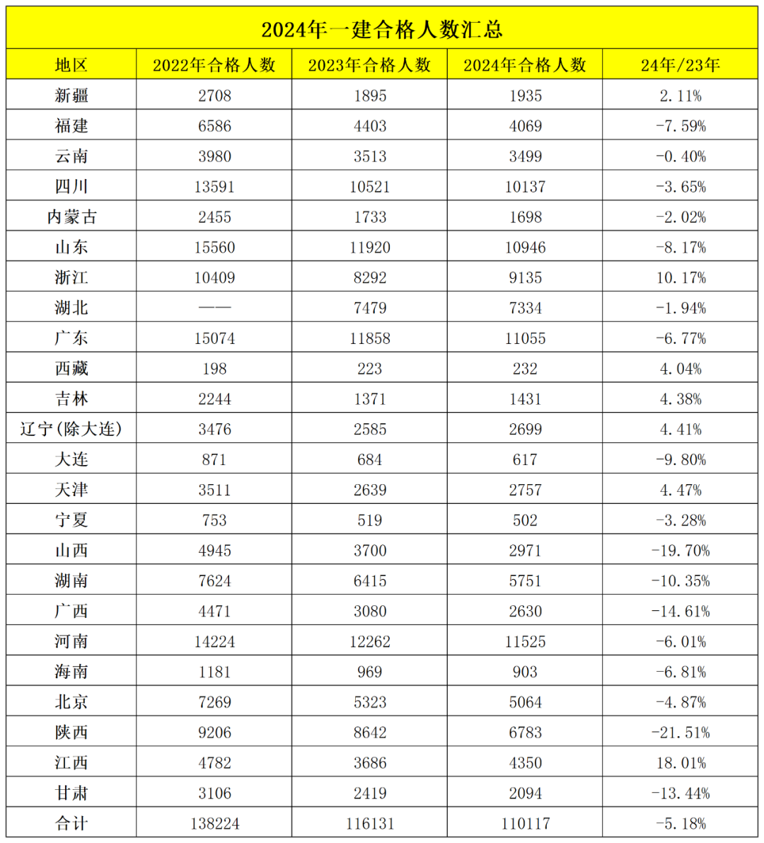 随着2024年一建成绩公布,截至目前,已有新疆、福建、云南、四川等23地公布了2024年一建考试合格人数,共有110117人合格。