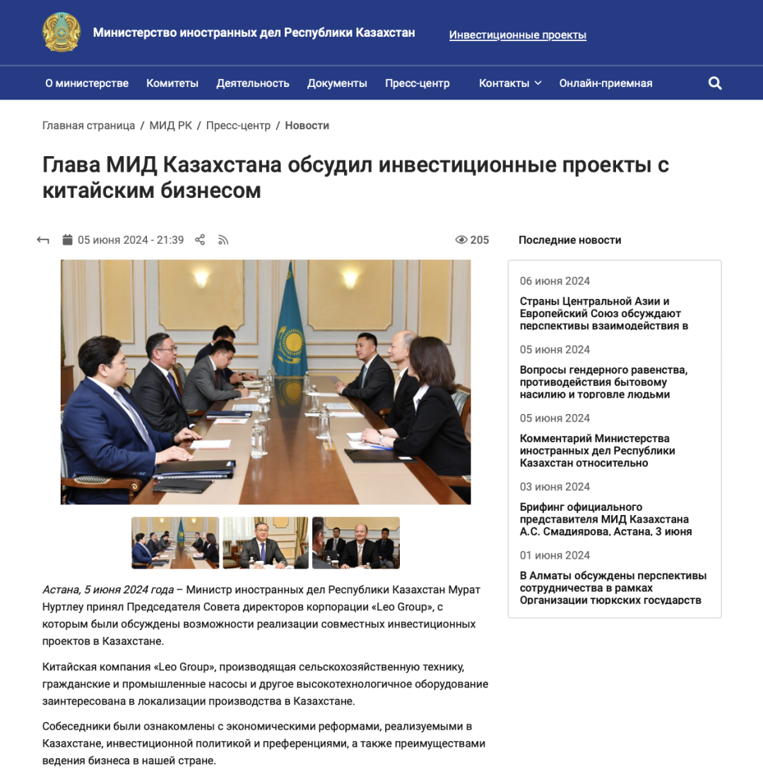 据哈萨克斯坦外交部官网新闻及哈萨克国际通讯社报道,当地时间6月5日下午,哈萨克斯坦副总理兼外长努尔特列乌在哈萨克斯坦外交部会见了利欧集团(Leo Group)董事长王相荣一行,双方就利欧集团在哈投资合作事宜深入讨论交流。