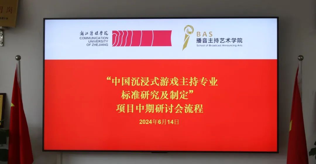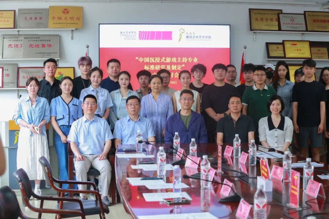 6月14日,“中国沉浸式游戏主持专业标准研究及制定”中期研讨会在浙江传媒学院第二实验楼会议厅成功举办。浙江省体育局体育经济处副处长楼文嵘,杭州市剧本娱乐协会秘书长王小龙、副会长何励、副会长陈俊、常务理事刘涛,浙江传媒学院播音主持艺术学院党委书记、副院长戚鸿峰,党委委员、副院长倪琦珺,副教授金叶、李海宏携青年教师吴景美、孙昊等师资研究力量,杭州游卡网络技术有限公司副总裁杜彬、副总裁应晓天及相关业务负责人,共同出席了此次研讨会。