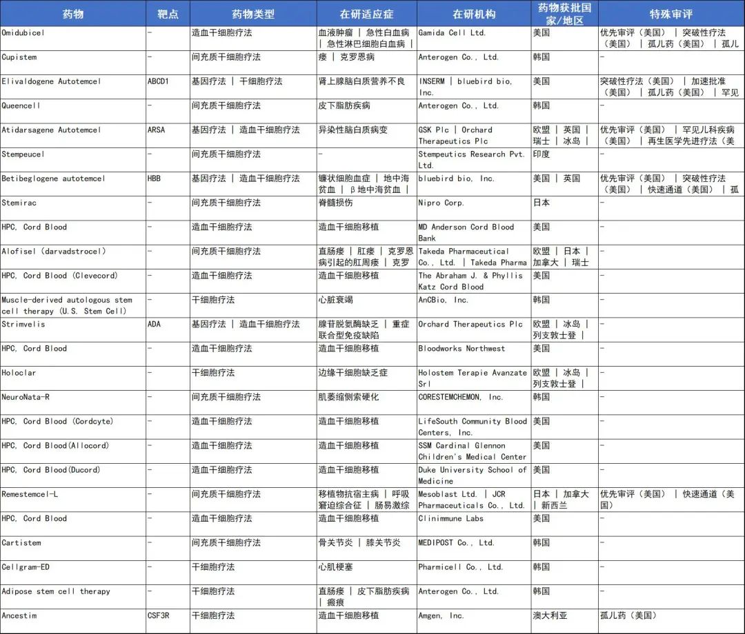 表2. 全球上市的干细胞疗法