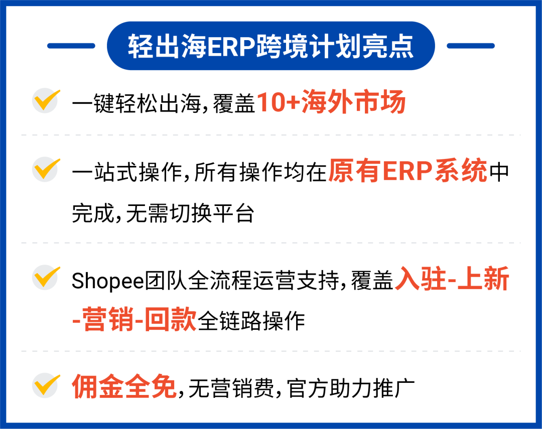 轻出海 ERP 跨境计划是 Shopee 与 ERP 合作伙伴联手推出的 “轻量级跨境出海解决办法”,借助打通 ERP 系统和 Shopee 海外站点,实现 “一键开铺、多站同步”,全流程降低成本、提升效率,帮助卖家轻松完成跨境出海。