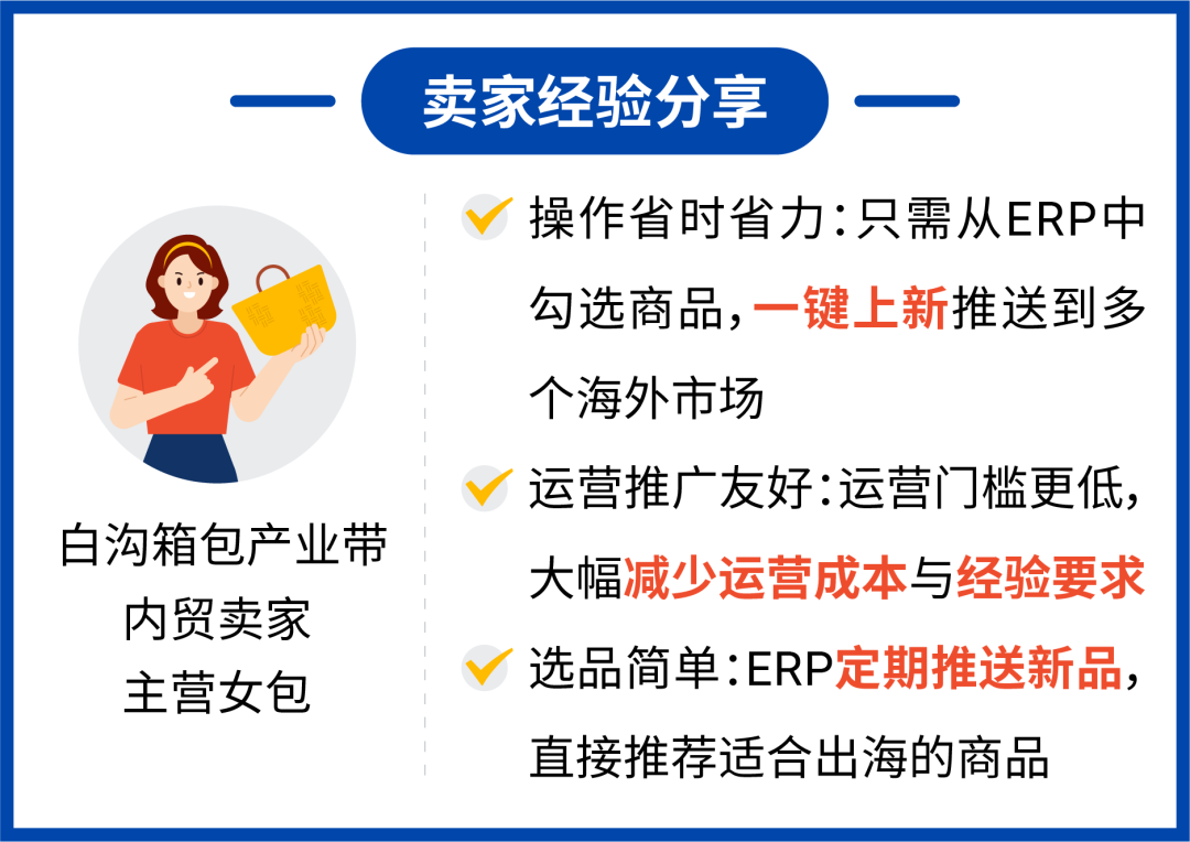 卖家只需通过 ERP 一键上架、发货,就能进入 10 多个优质市场。平台会为卖家处理营销运营、跨境履约、售后服务等环节。