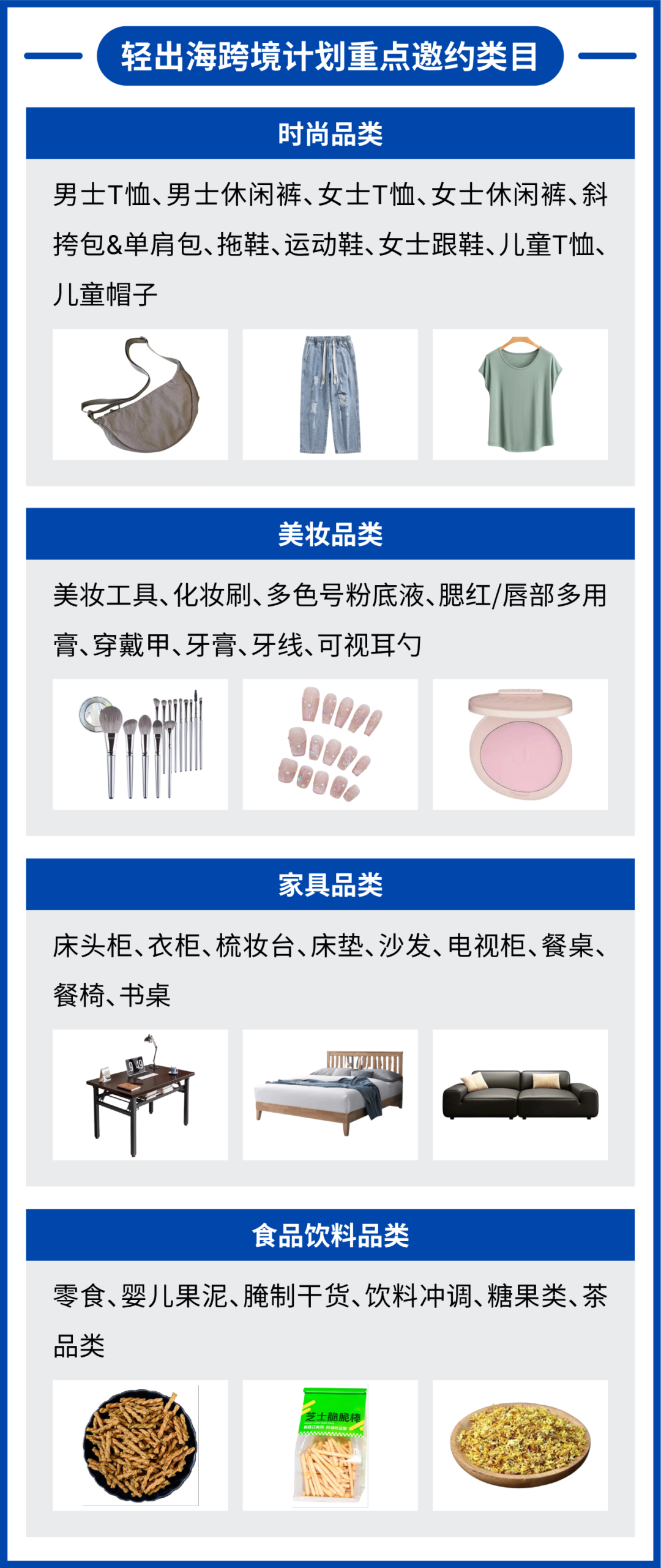 轻出海计划帮助优质内贸卖家轻松一键开铺、销往全球!如果您拥有以下重点邀约类目的资源,或者对轻出海计划感兴趣,欢迎私信小编,向官方经理进行一对一咨询。