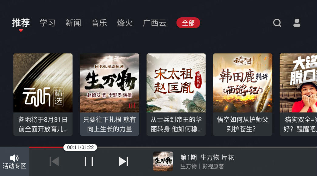 在车载场景下,收听有声内容已成为用户出行时的高频选择。作为中央广播电视总台重点建设的以音频为特色的新媒体平台,云听立足传统文化,坚定文化自信,围绕“经典、精品、经久”做文章,聚力打造“一书一库一平台”建设,推进价值传播。其中,“一库”为国家文化工程“中华文化经典有声库”,重点聚焦国学经典、文学经典、文艺经典三个方向,让经典著述以声音的方式继续得以传承。《生万物》《人世间》等文学经典在云听焕发新声,正是云听精品有声生态的体现。当前,平台库存精品有声书超3000部,独家的版权资源、专属的声线演绎、独特的听觉视角,让经典以更动人的方式呈现,陪伴车载用户度过有深度、有质感的出行时光。