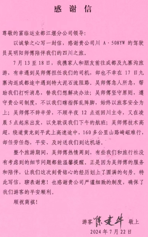 7月23日上午,一位旅客将一封感谢信送至富临长运都江堰分公司,表达对驾驶员吴明阳的赞扬和对公司的感谢。