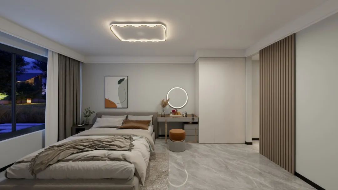 卧室延续整体空间白灰色调,更显高级。红棕色化妆凳、免漆木饰面,打破了空间的平淡乏味,每一处都彰显着居住者优雅的生活状态与情调。