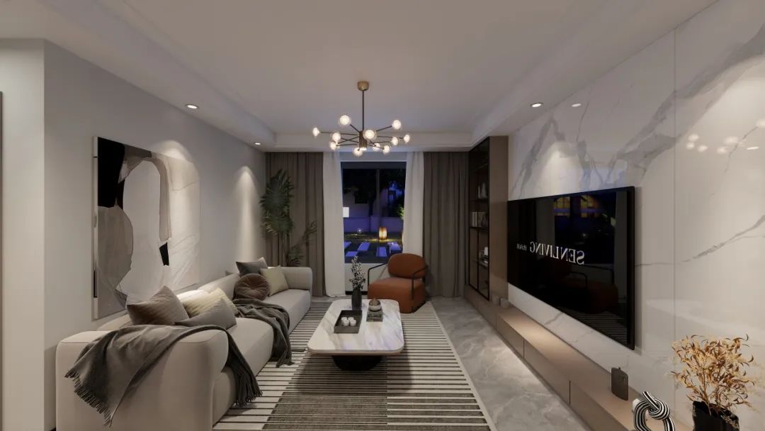 云石纹电视背景墙凸显出客厅整体的简约感。电视墙一侧及下边分别做收纳设计,满足基础储物需求。原木的温润与大理石的冷硬相结合,形成了一种刚柔并济的空间氛围。这种组合不仅在视觉上形成了强烈的对比,还在功能与美学上达到了精致的平衡。