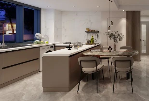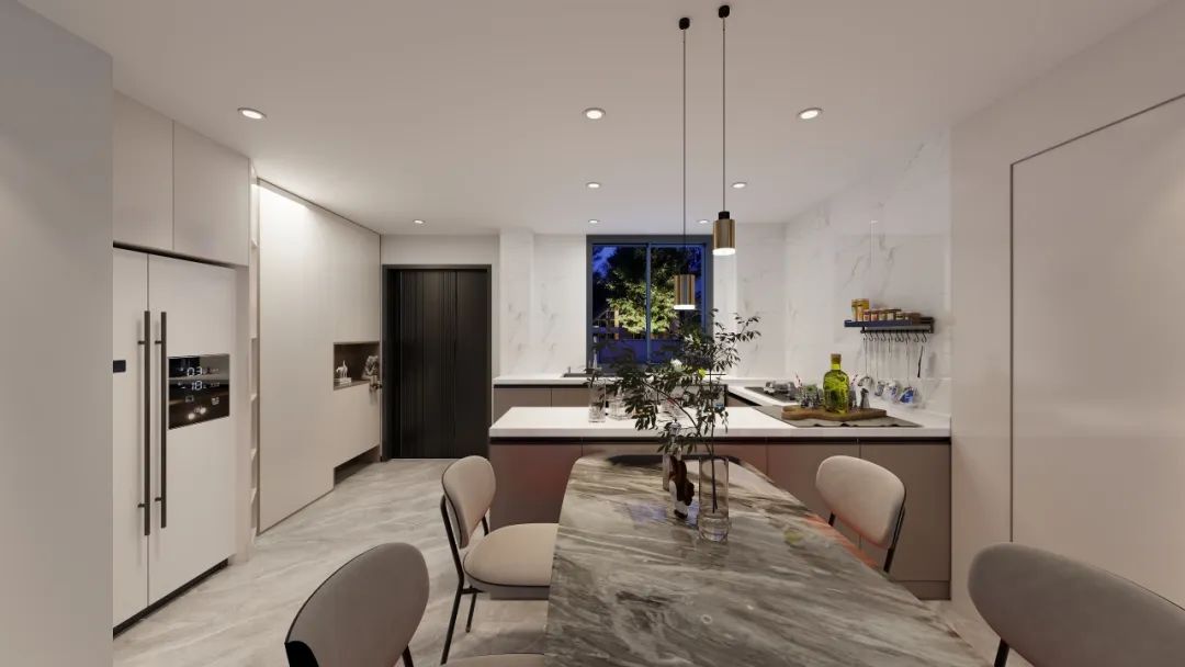 L型厨房➕岛台的设计,使厨房空间利用达到了极致。岛台设计不仅可以作为餐桌的延伸,增加用餐区域,还能与厨房的台面形成完美的呼应,让整个餐厨空间更加和谐统一。