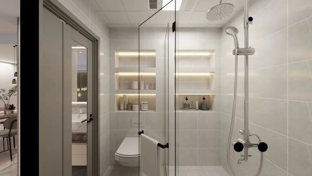 卫生间干湿分离,方便日常生活使用。地面墙面瓷砖通贴,不仅提升了浴室的整体美感,还方便了日常的清洁和维护工作。而淋浴间和马桶上方对称型壁龛设计,则让洗发水、沐浴露、卫生纸等日用清洁用品在此找到了各自的归宿。