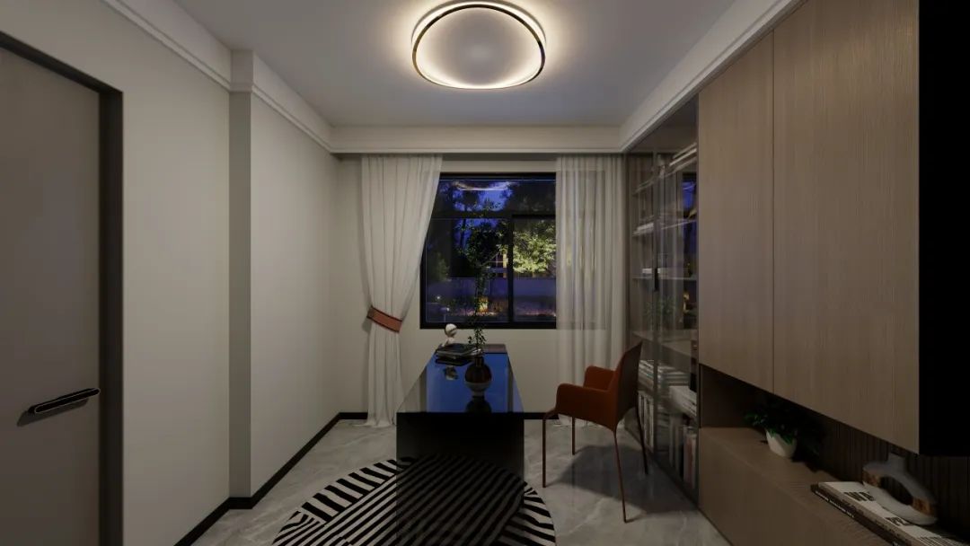 经典的黑白灰作为主色调,辅以红棕色的点缀,为书房营造出一种简洁而不失活力的氛围。藏露结合的书架设计,不仅为业主提供了充足的储物空间,还以其自然的木质纹理和温暖的色调,为空间增添了一抹自然与质朴的气息。
