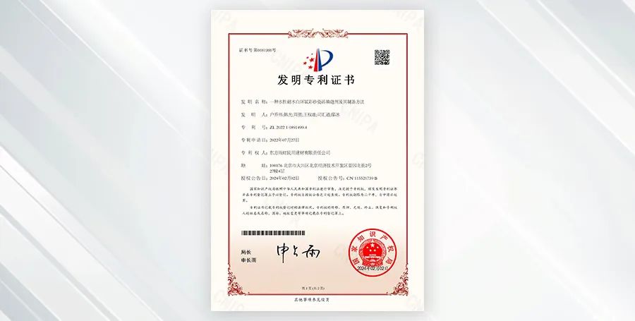 2024年2月,东方雨虹“臻·可耐水性净味彩砂美缝剂”荣获中国发明专利证书(专利号:ZL202310268546.4。)