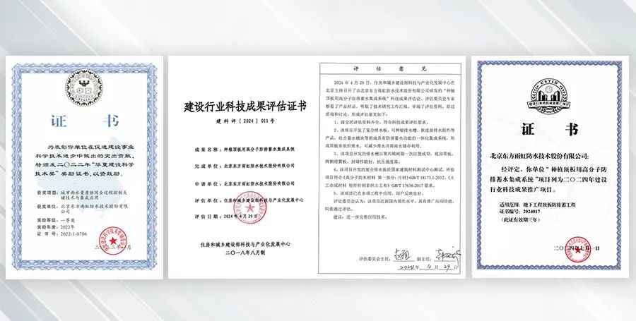 这一系列荣获认证的获得,不仅是对东方雨虹在产品研发、专利技术、创新应用等方面取得成果成效的充分肯定,更是对雨虹桃花源零坡度有组织防排蓄水系统的实用性、创新性和先进性的高度认可。